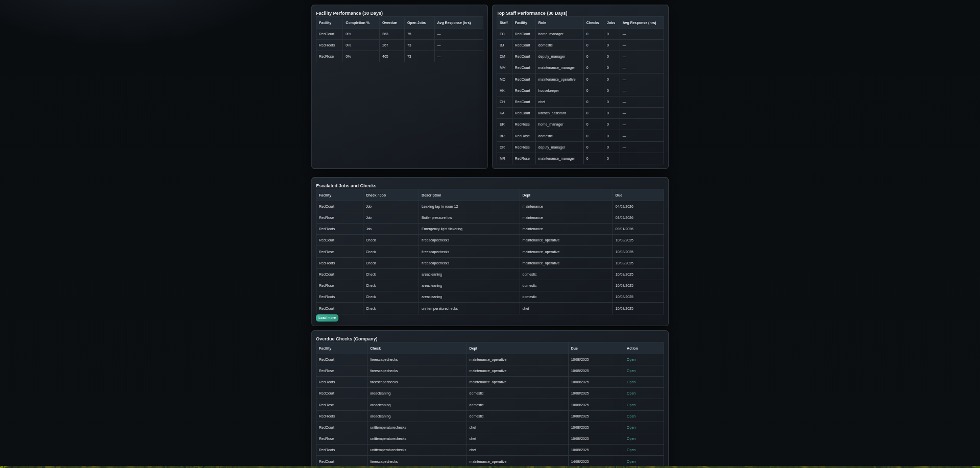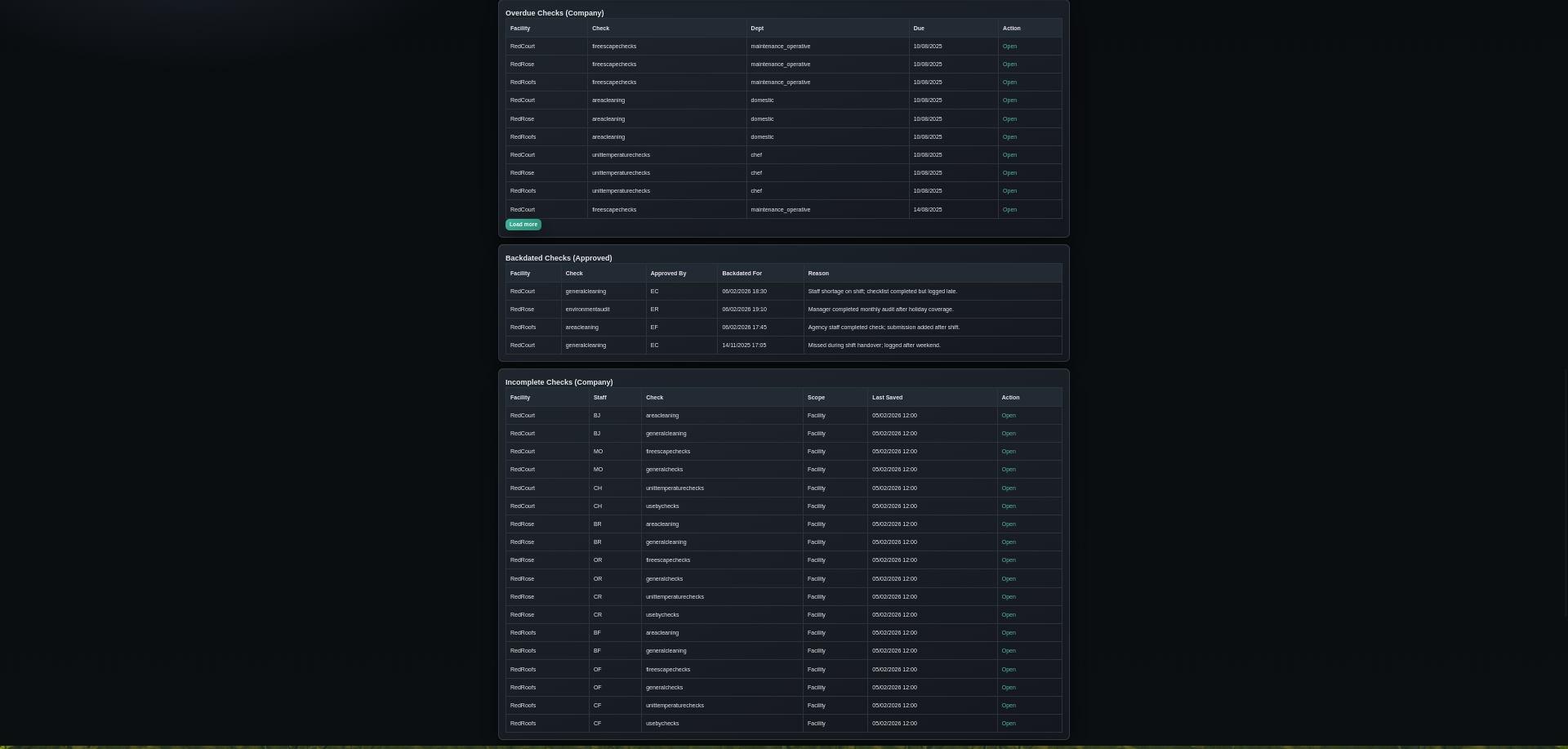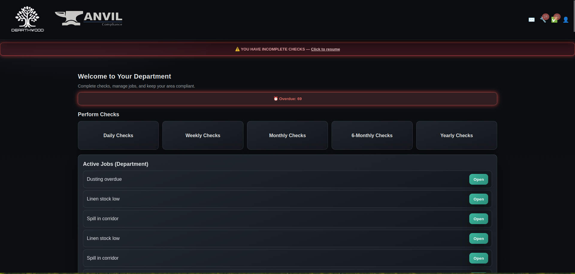 Anvil manages compliance across all operational departments – Maintenance, Domestic Services, and Kitchen operations. Each department gets tailored checklists, reporting systems, and performance tracking, all feeding into unified management dashboards.
