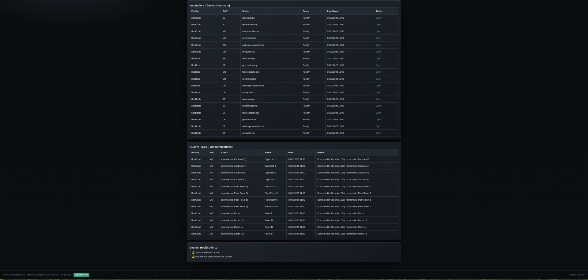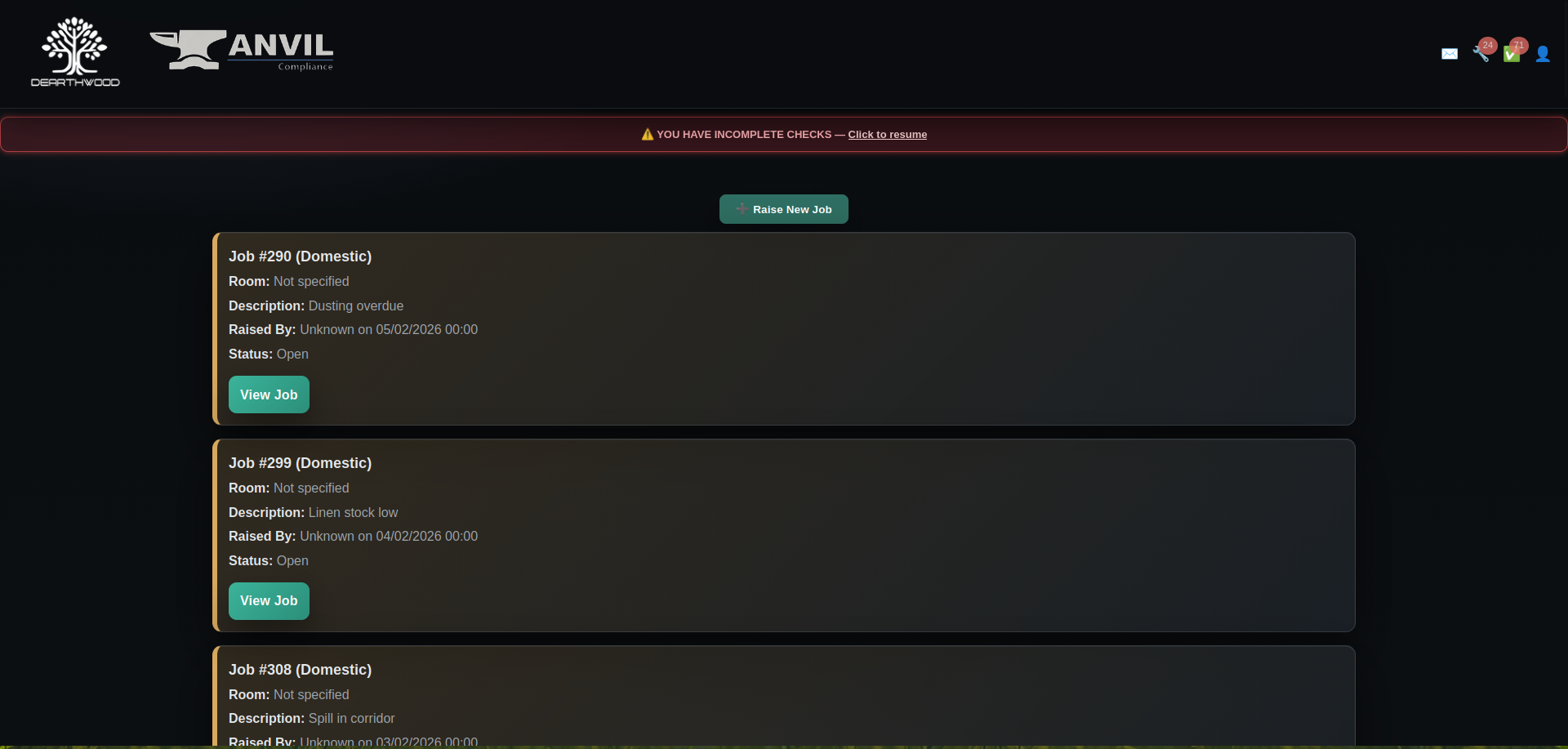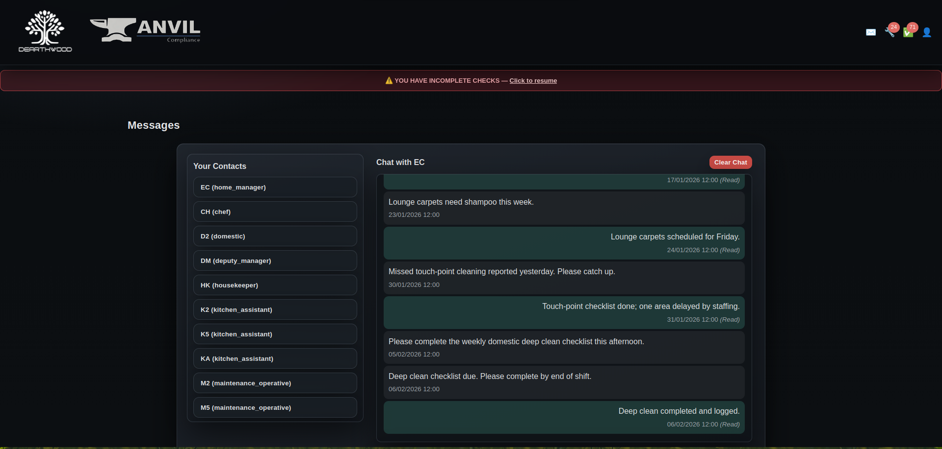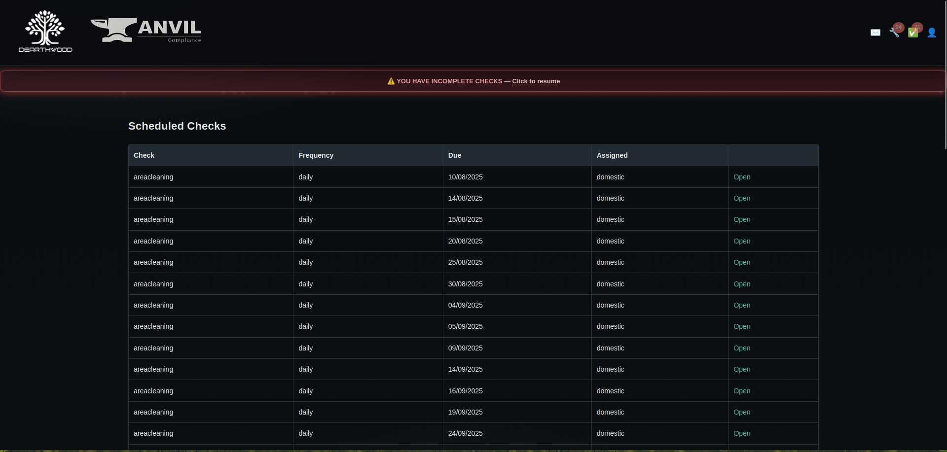 Anvil manages compliance across all operational departments – Maintenance, Domestic Services, and Kitchen operations. Each department gets tailored checklists, reporting systems, and performance tracking, all feeding into unified management dashboards.